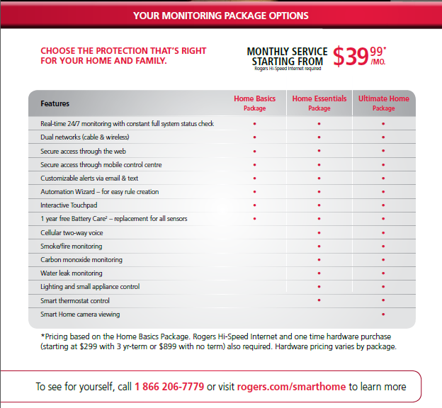 • 24/7 monitoring connected through the Rogers wireless network meaning no landline phone is required for service or emergency situations