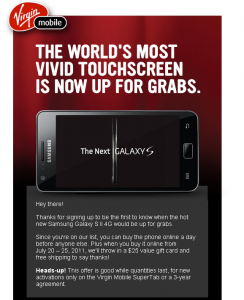 So we all knew that this day was coming, the Samsung Galaxy S II will be available on both Bell and Virgin starting tomorrow morning, we already had confirmation of the price from Bell and Virgin has now decided to break their silence and release a quick email to everyone who had signed up for information about the Galaxy S II (that promised something special for signing up)