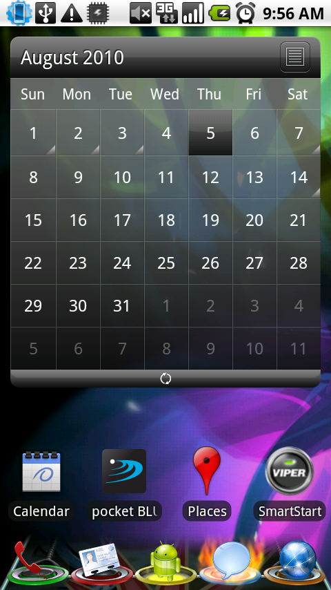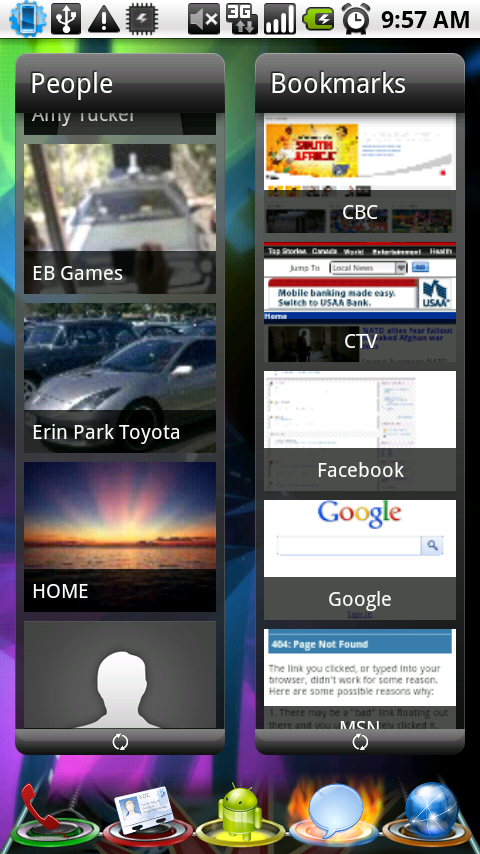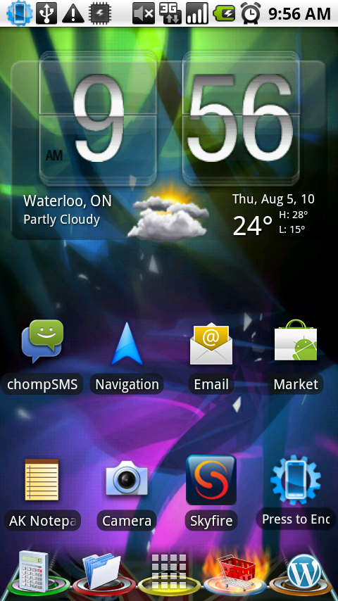 Now more importantly, why should you get this Home Screen replacement? Well for some of us who haven’t been upgraded to Android 2.2 yet, this gives you a lot of the functionality! You get the same look and feel as Froyo as well as customizable launcher icons along the bottom row (5 that you can change the images, the backgrounds, and can scroll through 2 other pages of them) These icons are basically like the icons you put on your home screen but these are accessible on any of the pages and are generally just like shortcuts!