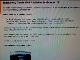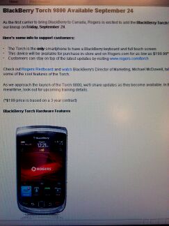 So we just got a quick screen grab from an internal rogers system showing an update on the status of the much anticipated blackberry torch, we already knew it was coming to Rogers on friday september 24 but this is showing that available customers for upgrades and new customers alike will be able to grab one on for a cool $199.99 on a new 3 year term of course!